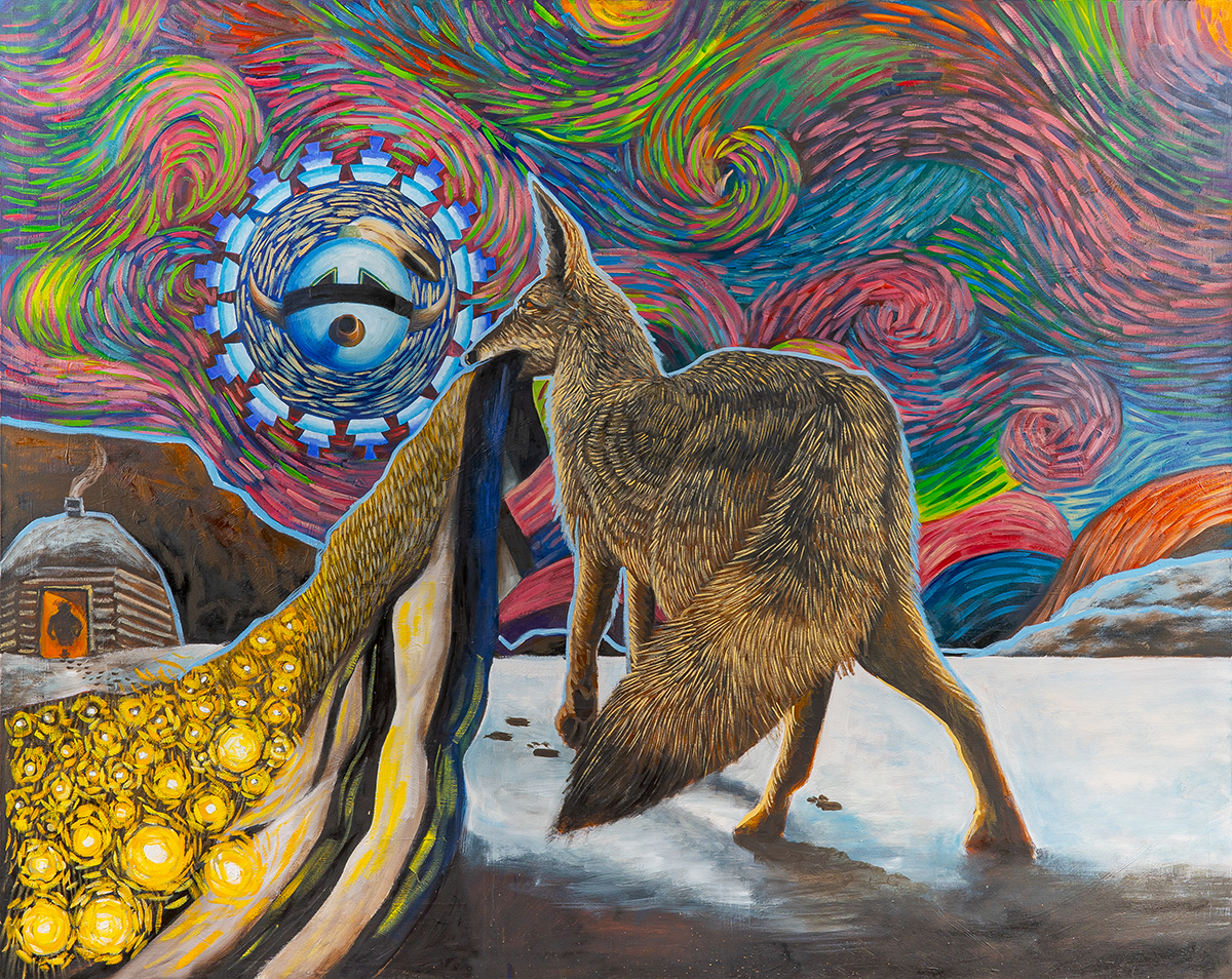 Image caption: Piersten Doctor, Coyote Stealing the Stars, 2025, oil paint on canvas