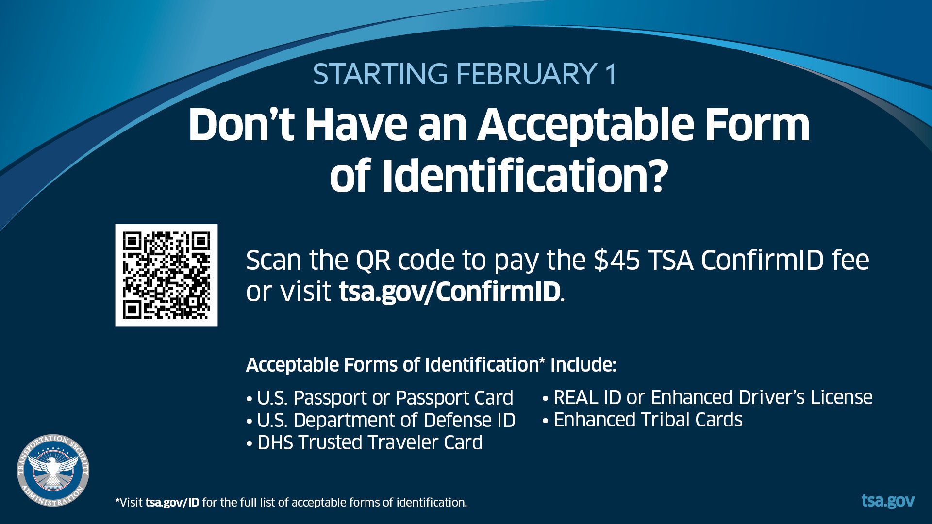 Starting Feb. 1, 2026, passengers who do not present an acceptable form of ID (including non-REAL ID compliant state-issued identification) at TSA checkpoints may verify their ID using the TSA ConfirmID fee-based service. Learn more about TSA ConfirmID at tsa.gov/tsaconfirm-id.