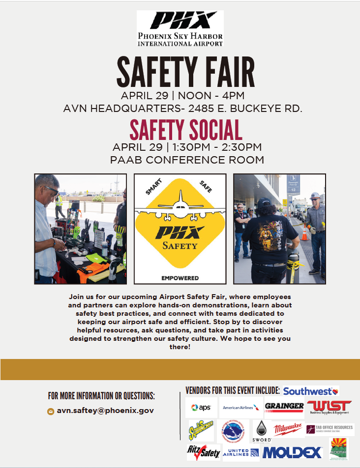We look forward to seeing you at this year’s Safety Fair and appreciate your continued commitment to maintaining a safe and collaborative environment at Phoenix Sky Harbor International Airport.