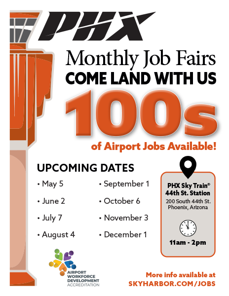 Read MoreThe next monthly Airport Job Fair is on Tuesday, May 5, from 11 a.m. to 2 p.m. at the 44th Street PHX Sky Train® Station located at 44th and Washington streets.