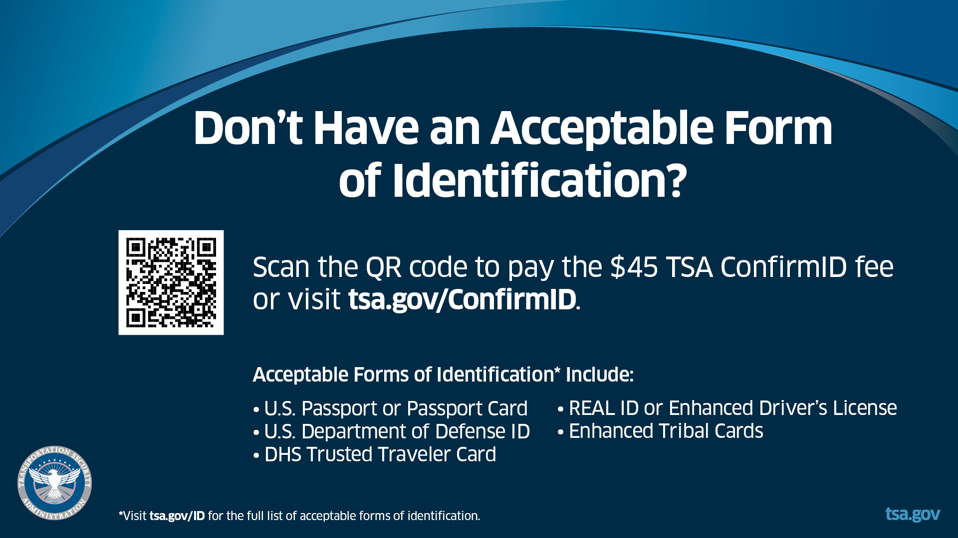 Starting Feb. 1, 2026, passengers who do not present an acceptable form of ID (including non-REAL ID compliant state-issued identification) at TSA checkpoints may verify their ID using TSA ConfirmID, TSA’s modernized alternative identity verification option. TSA ConfirmID is a fee-based service designed to enhance security and streamline identity verification for air travelers who do not have an acceptable form of ID. Visit the skyhabor.com Security Screening page for more information and links.