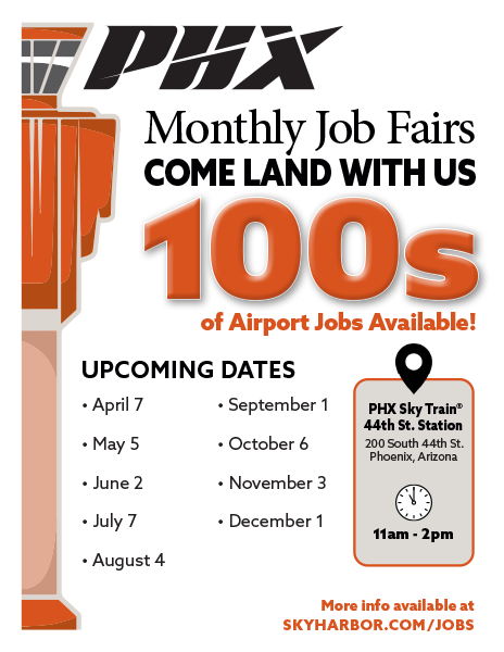 Read MoreNext month’s Aviation Job Fair is on April 7, at the 44th Street PHX Sky Train® station.