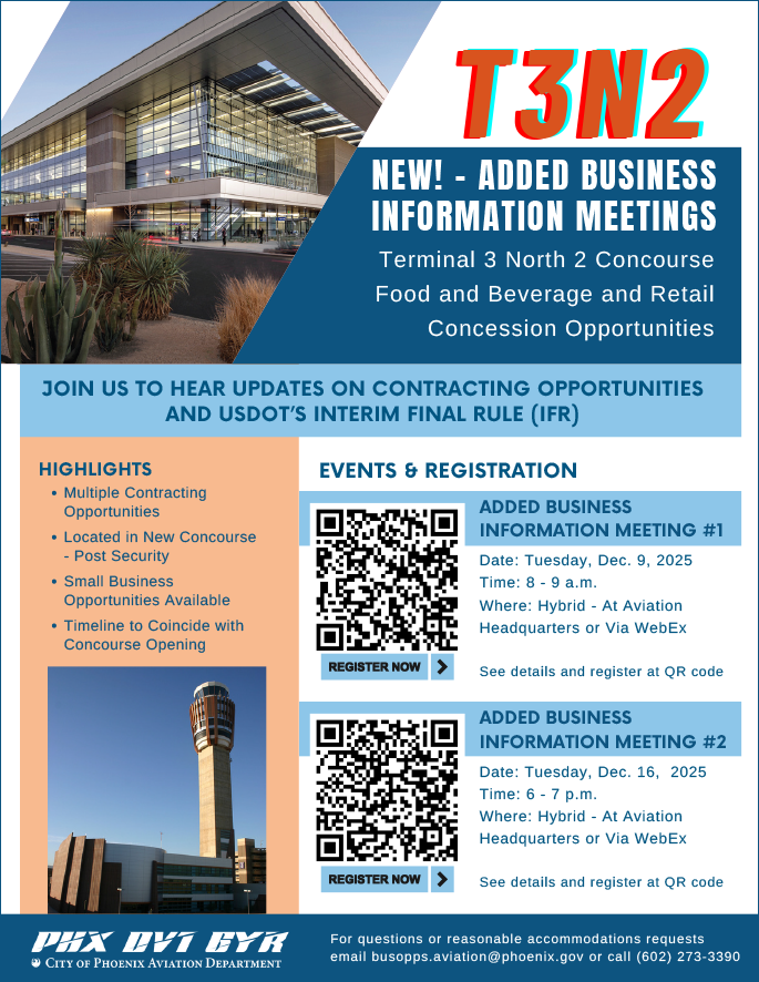 The City of Phoenix Aviation Department is conducting two additional Business Information Meetings for concession operators and other interested parties including potential concessions suppliers, in preparation for the release of competitive Revenue Contract Solicitations for Terminal 3 North 2 Concourse concession opportunities. Interested parties are encouraged to attend the added Business Information meetings to hear updates on contracting opportunities and USDOT’s Interim Final Rule.