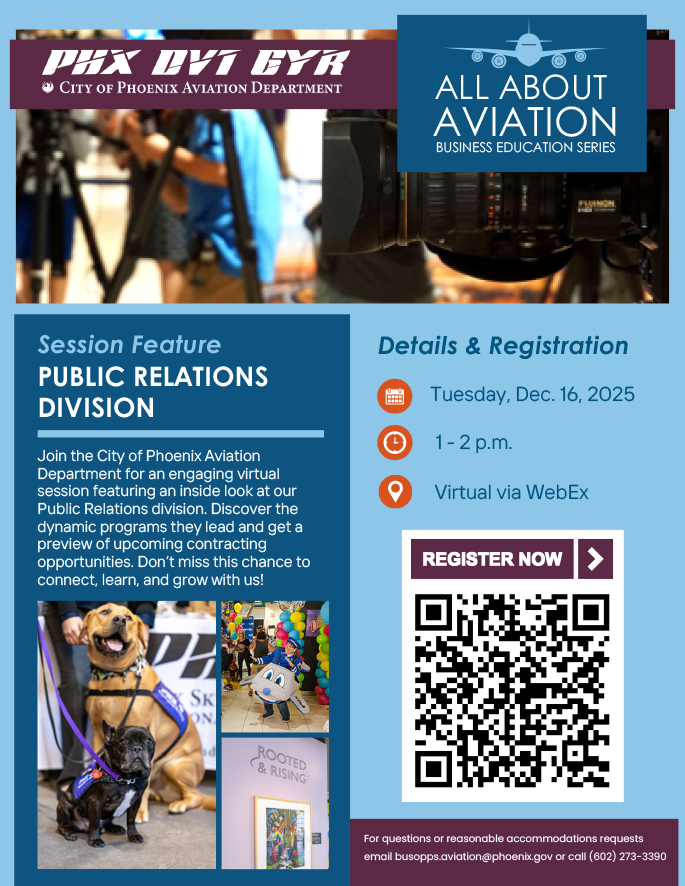 Join the City of Phoenix Aviation Department for an engaging virtual session featuring an inside look at our Public Relations division. Discover the dynamic programs they lead and get a preview of upcoming contracting opportunities. This session will take place virtually on December 16, 2025, from 1-2 p.m. (Local AZ Time). Don’t miss this chance to connect, learn, and grow with us!