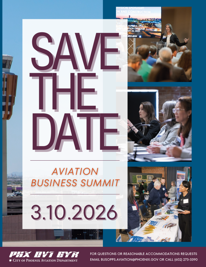 Join the City of Phoenix Aviation Department in person for the 8th Aviation Business Summit on March 10, 2026! This dynamic event offers valuable insights into how to do business with Phoenix Sky Harbor, Deer Valley, and Goodyear airports. We’re excited to welcome you back for this event that will include informational sessions, expert panels, and important networking opportunities to help you connect, learn, and grow.