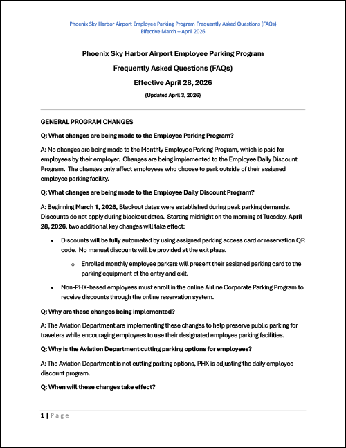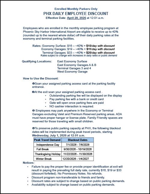 To receive the Employee Parking Newsletter, send an email request to skyharbor@phoenix.gov.