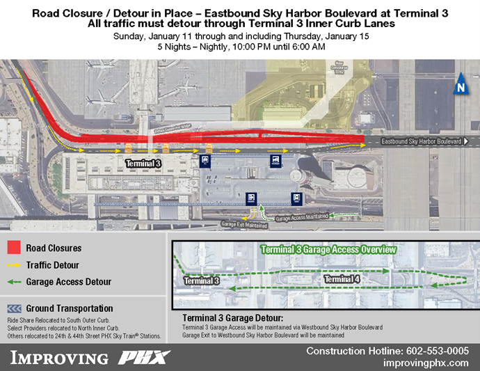 - Terminal 3 Garage Detour: Terminal 3 Garage access and exit will be maintained on the south side via Westbound Sky Harbor Boulevard.