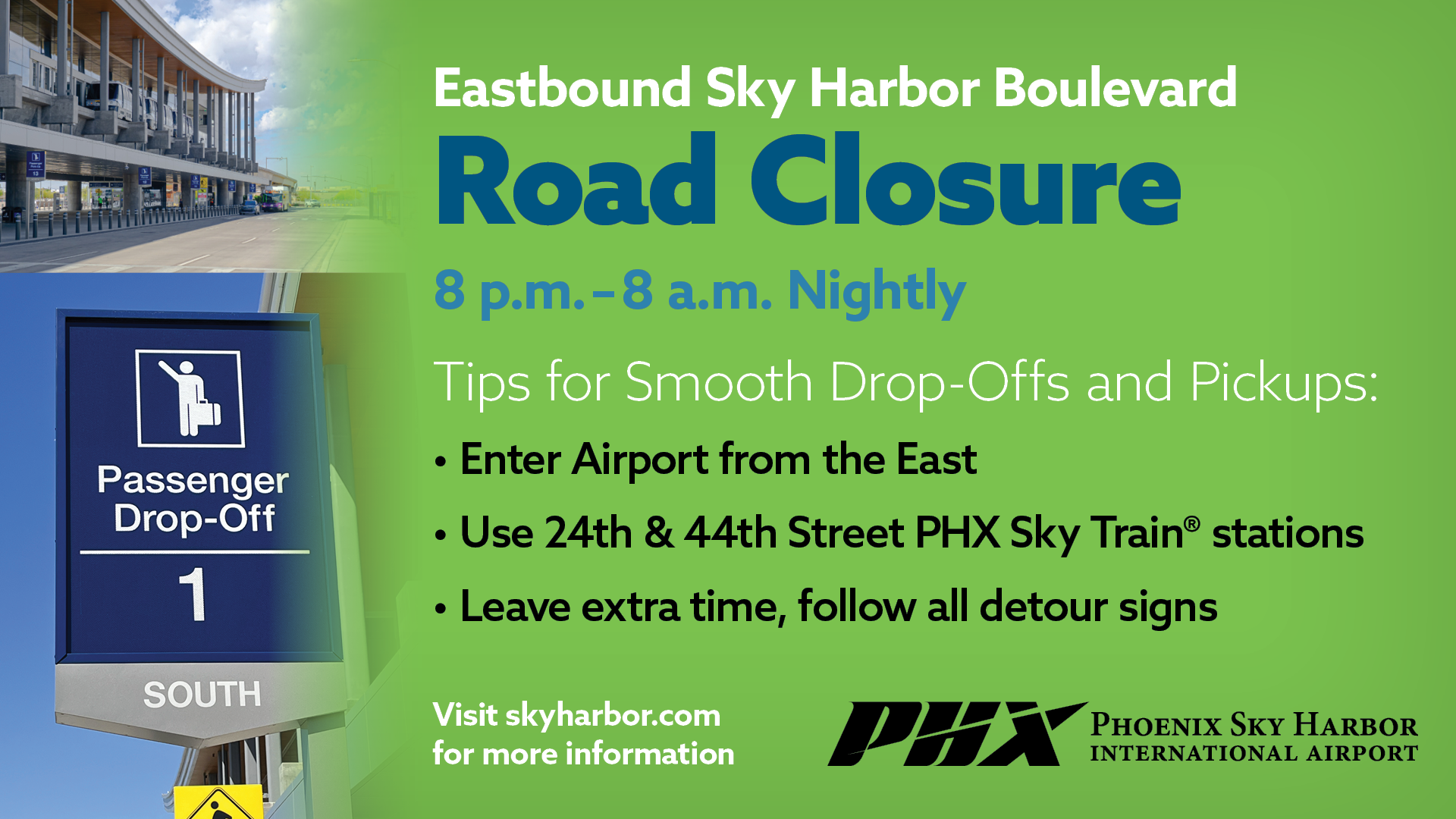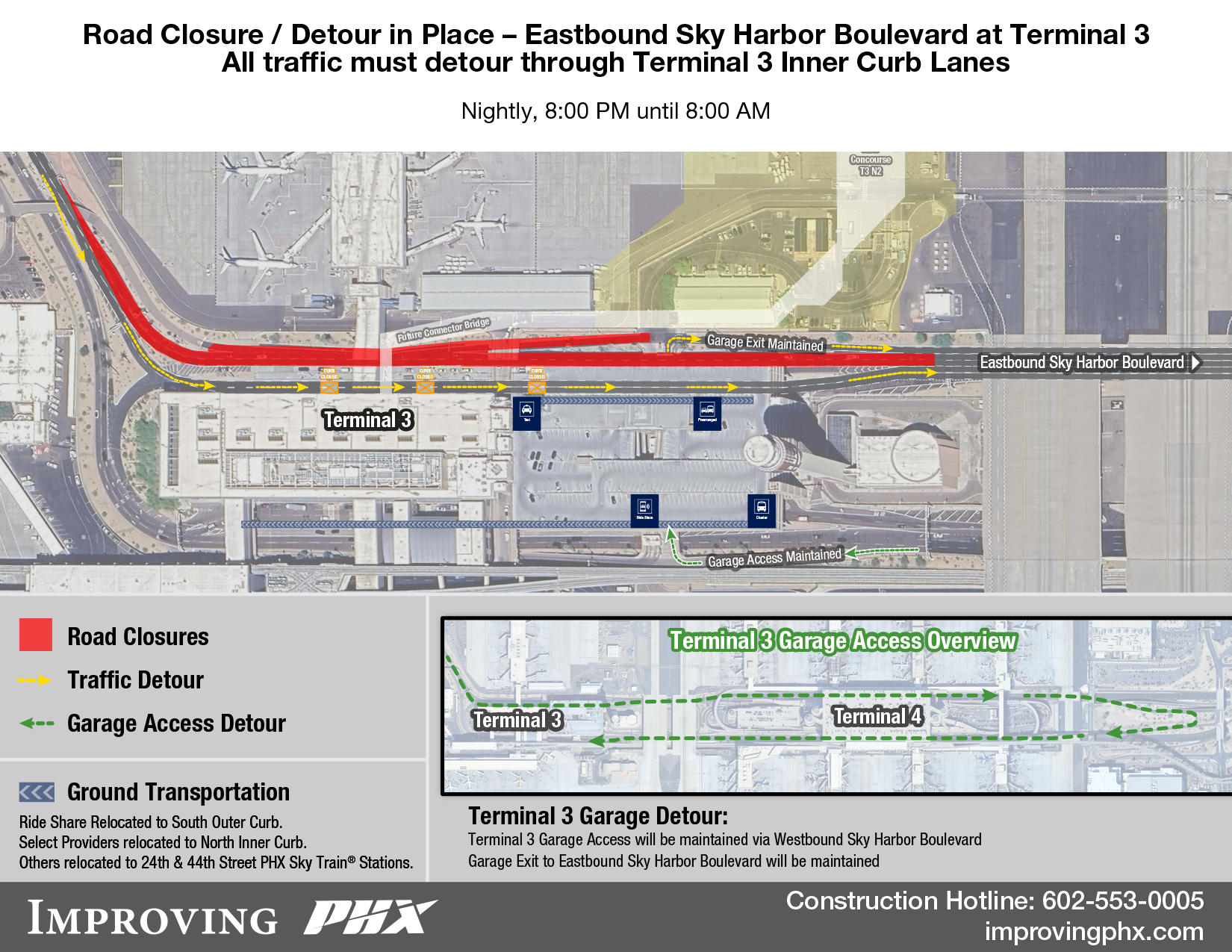 Sky Harbor Boulevard’s eastbound outer lanes on the north side of Terminal 3 are closed nightly from 8 p.m. to 8 a.m. Drivers will be detoured to Terminal 3's Inner Curb lanes.