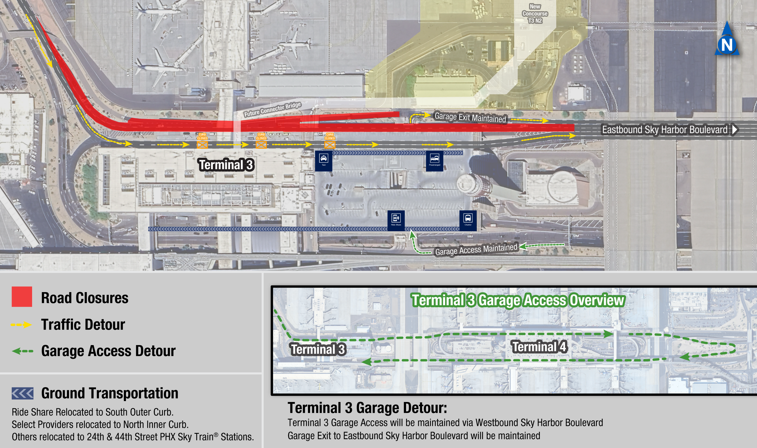 Access to the Terminal 3 Garage will be open from Westbound Sky Harbor Boulevard, and the garage exit to Eastbound Sky Harbor Boulevard will also remain open.