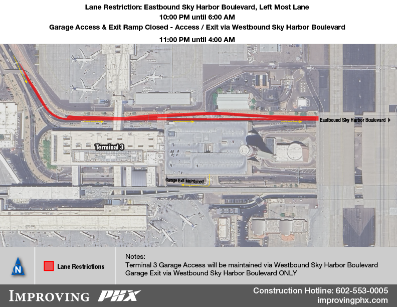 The north Terminal 3 parking garage access ramp and exit ramp will be closed from 11 p.m. to 4 a.m. Monday, Dec. 1, through Friday, Dec. 5. Parking garage access and exit will be maintained through westbound Sky Harbor Boulevard on the south side of Terminal 3.