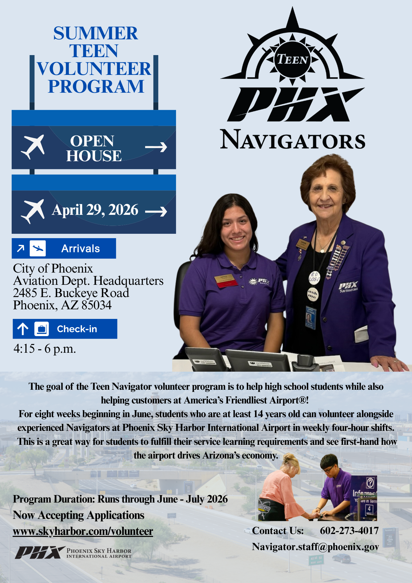 Teen Navigators will help some of the 130,000 daily visitors by assisting at interactive directories, providing directions, or just offering friendly smiles. This is a great way for a student to fulfill their service learning requirements and see first-hand how the airport drives Arizona’s economic engine.